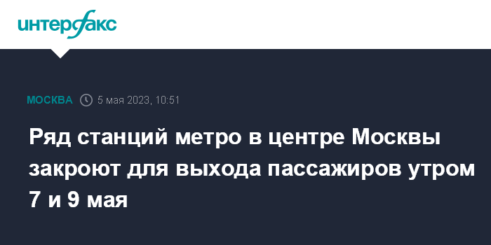 Москва. 5 мая. INTERFAX.RU - Ряд станций метро в центре города, среди которых "Охотный ряд", "Театральная", "Арбатская", "Библиотека имени Ленина", будут недоступны для выхода пассажиров в город утром 7 и 9 мая, на других станциях в центре могут быть введены ограничения.