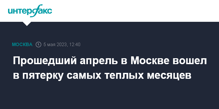 Москва. 5 мая. INTERFAX.RU - Прошедший апрель для Москвы стал одним из самых теплых за историю метеонаблюдений, такая погода наблюдается примерно раз в 30 лет; в целом по стране температура в апреле была около нормы, сообщил научный руководитель Гидрометцентра России Роман Вильфанд.
