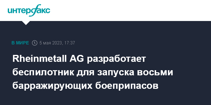 Москва. 5 мая. INTERFAX.RU - Немецкий оборонный концерн Rheinmetall AG ведет работы над БПЛА, который сможет нести до восьми барражирующих боеприпасов, а затем запустить их по целям, сообщает Defense news.