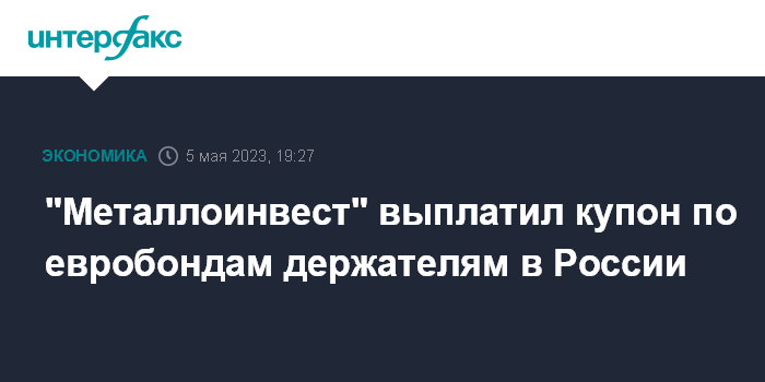Москва. 5 мая. INTERFAX.RU - "Металлоинвест" выплатил купон по долларовым еврооблигациям с погашением в 2028 году держателям, учет прав которых ведется российскими депозитариями, остальным инвесторам платеж не дошел из-за отказа платежного агента обрабатывать его, сообщила компания.