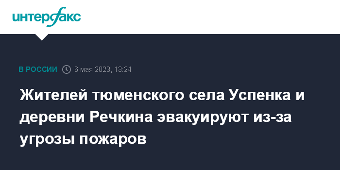 Москва. 6 мая. INTERFAX.RU - Эвакуация жителей идет в селе Успенка и деревне Речкина Тюменского района в связи с возможной угрозой природных пожаров, сообщает в субботу информационный центр правительства Тюменской области.