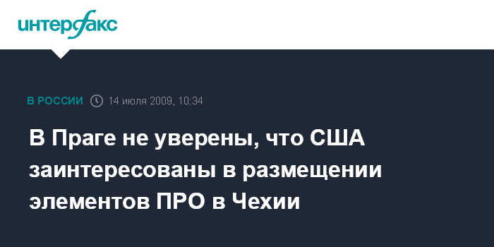 Москва. 14 июля. INTERFAX.RU - Президент Чехии Вацлав Клаус заявляет, что на данный момент Праге неизвестно, заинтересованы ли США в размещении объектов ПРО на чешской территории. При этом Клаус отметил, что сам он поддерживает идею размещения американской ПРО в Чехии.