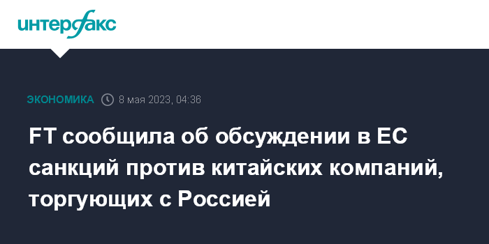 Москва. 8 мая. INTERFAX.RU - В Евросоюзе рассматривается предложение о введении санкции в отношении китайских компаний, которые продают России оборудование, которое, как считают в ЕС, может быть использовано военно-промышленным комплексом России, сообщила Financial Times.