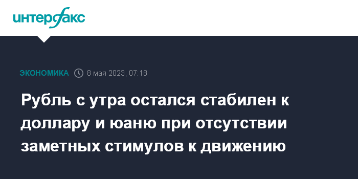 Москва. 8 мая. INTERFAX.RU - Изменения доллара США и китайского юаня на старте торгов понедельника на Московской бирже незначительные, рубль стабилен к основным мировым валютам на фоне пониженной активности торгов в официальный праздничный день и отсутствия сильных драйверов для движения в ту или иную сторону.