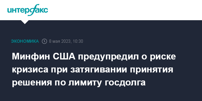 Москва. 8 мая. INTERFAX.RU - Министр финансов США Джанет Йеллен вновь предупредила о серьезных последствиях, которые могут наступить, если американский Конгресс не повысит лимит госдолга.