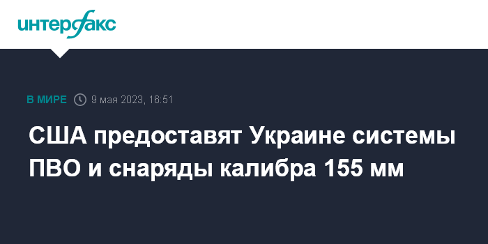 Москва. 9 мая. INTERFAX.RU - США в рамках очередного пакета военной помощи Украине на сумму $1,2 млрд направят ей системы ПВО и боеприпасы к ним, а также 155-миллиметровые артиллерийские снаряды, говорится в пресс-релизе Пентагона.