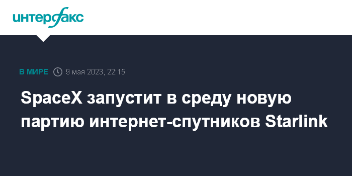 Москва. 9 мая. INTERFAX.RU - Ракета-носитель Falcon 9 в среду стартует на орбиту с очередной партией из 51 мини-спутника для пополнения орбитальной группировки глобальной сети интернет-покрытия системы Starlink, сообщила компания-разработчик SpaceX.
