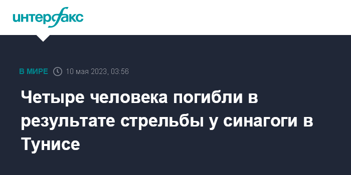Москва. 10 мая. INTERFAX.RU - Четыре человека погибли, еще шестеро получили ранения в результате стрельбы накануне вечером у синагоги Гриба на острове Джерба в Тунисе, сообщили местные СМИ со ссылкой на МВД страны.