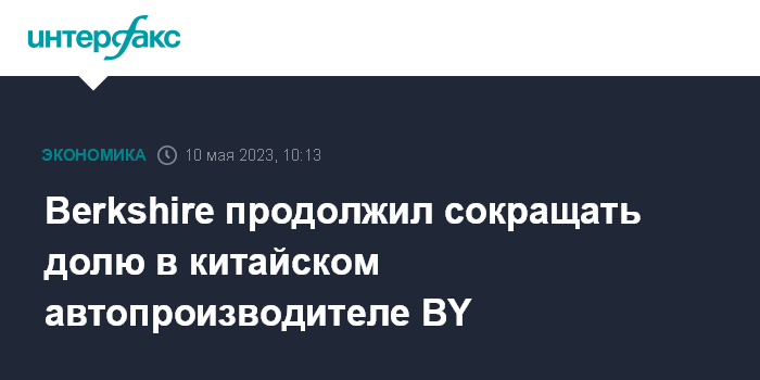 Москва. 10 мая. INTERFAX.RU - Инвестиционная компания миллиардера Уоррена Баффета Berkshire Hathaway продолжает сокращать свою долю в BYD Co., ведущем китайском производителе автомобилей на новых источниках энергии (NEV).