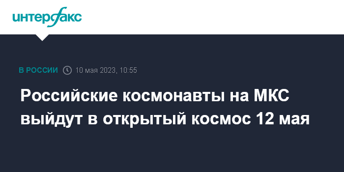 Москва. 10 мая. INTERFAX.RU - Российские космонавты Сергей Прокопьев и Дмитрий Петелин 12 мая выйдут в открытый космос с борта Международной космической станции (МКС), сообщили в "Роскосмосе".