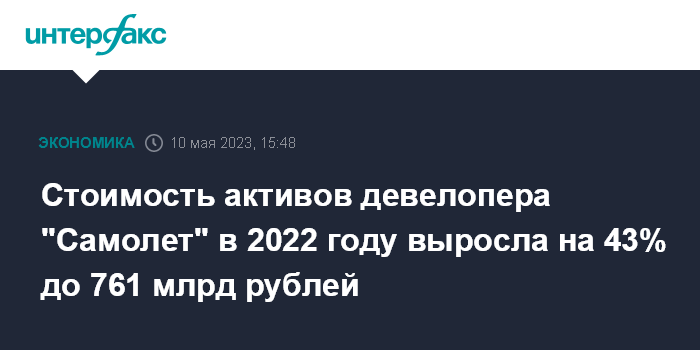 Москва. 10 мая. INTERFAX.RU - Стоимость активов группы "Самолет", по оценке Commonwealth Partnership (бывшая Cushman & Wakefield), по состоянию на конец 2022 года составила 761 млрд рублей, сообщил девелопер. По сравнению с оценкой на конец 2021 года стоимость активов выросла на 43%.