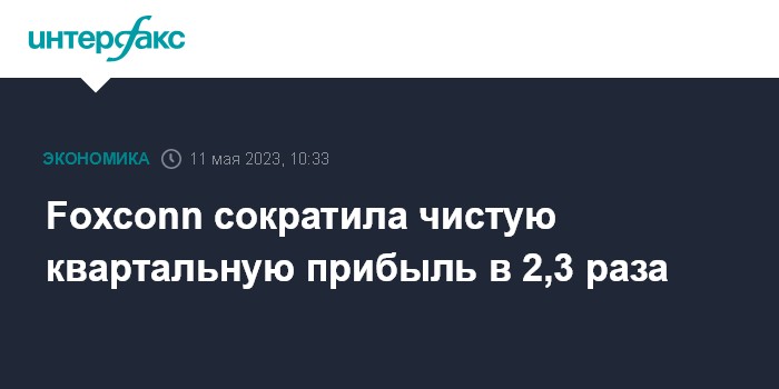Москва. 11 мая. INTERFAX.RU - Тайваньская Hon Hai Precision Industry Co. (Foxconn Technology), крупнейший в мире производитель электроники по контрактам и поставщик Apple, зафиксировала максимальное за три года снижение чистой прибыли в первом квартале 2023 года в условиях ослабления глобального спроса на потребительские устройства.