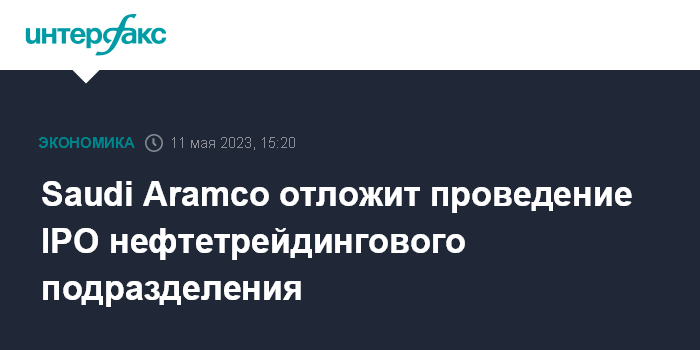 Москва. 11 мая. INTERFAX.RU - Саудовская госкомпания Saudi Aramco откладывает проведение IPO нефтетрейдингового подразделения, которое могло стать одним из крупнейших в мире в этом году, сообщает Bloomberg со ссылкой на информированные источники.