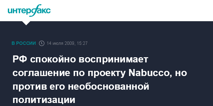 Москва. 14 июля. INTERFAX.RU - В Москве спокойно восприняли подписание межправительственного соглашения о строительстве газопровода Nabucco, но призывают не политизировать реализацию данного проекта. По словам источника в МИД РФ, "мы полагаем, что вопросы реализации данного проекта зачастую необоснованно политизируются и используются для раздувания не имеющей под собой оснований темы преодоления чрезмерной энергетической зависимости европейских стран от России".