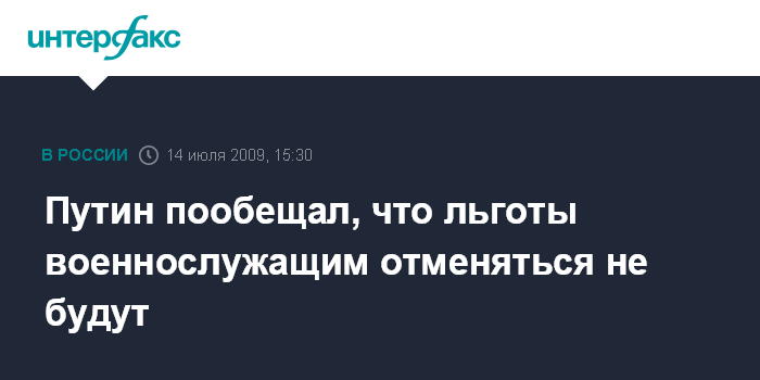 Москва. 14 июля. INTERFAX.RU - Правительство не планирует отмену имеющихся льгот военнослужащим, заявил премьер-министр РФ Владимир Путин. Он подчеркнул, что даже если кто-то и собирается внести такие предложения, они "не будут поддержаны".