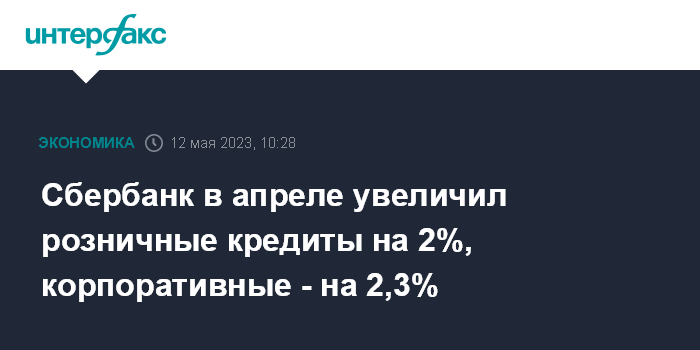 Москва. 12 мая. INTERFAX.RU - Сбербанк в апреле увеличил розничный кредитный портфель по РСБУ на 2%, корпоративный - на 2,3%, говорится в пресс-релизе крупнейшего российского коммерческого банка.