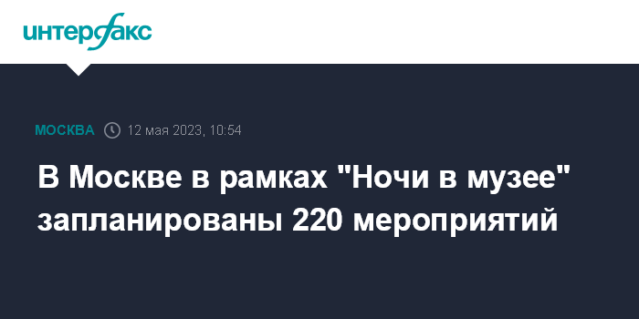 Москва. 12 мая. INTERFAX.RU - В Москве в рамках акции "Ночь в музее" 20 мая 2023 года запланированы более 220 мероприятий, сообщила через пресс-службу Департамента культуры заммэра столицы Наталья Сергунина. Акция пройдет в городе в 17-й раз.