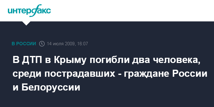 Москва. 14 июля. INTERFAX.RU - В Симферопольском районе Крыма в результате столкновения автомобиля "ВАЗ-2101" и микроавтобуса "Merсedes Sprinter" Крыма один человек погиб на месте происшествия, еще один скончался в больнице. Госпитализированы 17 пострадавших.