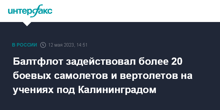 Москва. 12 мая. INTERFAX.RU - Более 20 истребителей, бомбардировщиков и боевых вертолетов Балтфлота задействованы в учениях в Калининградской области, сообщает пресс-служба флота в пятницу.