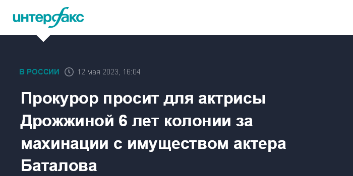Москва. 12 мая. INTERFAX.RU - Государственный обвинитель просит суд назначить актрисе Наталье Дрожжиной наказание в виде шести лет лишения свободы и ее мужу Михаилу Цивину - семь лет лишения свободы по делу о хищении недвижимости и денег артиста Алексея Баталова, сообщает прокуратура Москвы в пятницу.
