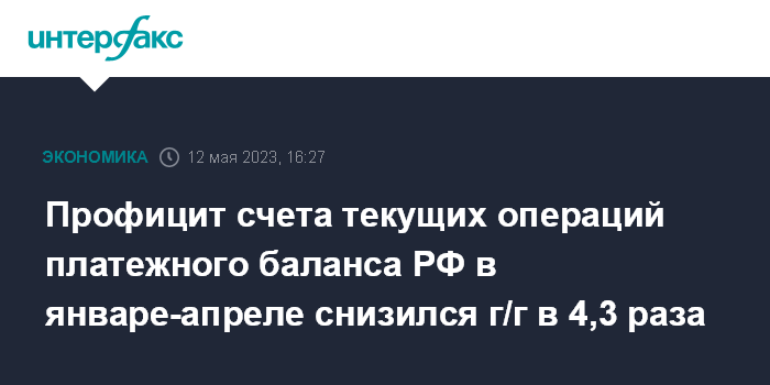 Москва. 12 мая. INTERFAX.RU - Положительное сальдо счета текущих операций платежного баланса РФ в январе-апреле 2023 года, по предварительной оценке, снизилось в 4,3 раза - до $22,6 млрд по сравнению с $96,5 млрд за аналогичный период 2022 года, сообщается в материалах на сайте ЦБ РФ.