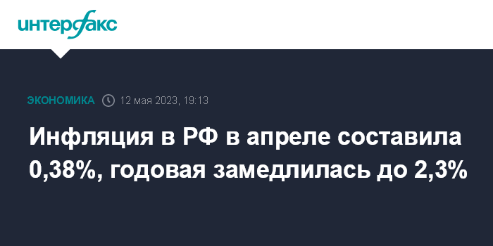 Годовая инфляция, по данным Росстата, в апреле 2023 года замедлилась до 2,31% (аналитики также ожидали замедления до 2,3%) с 3,51% на конец марта, 10,99% на конец февраля, 11,77% на конец января и 11,94% на конец декабря 2022 года. Годовая инфляция в апреле достигла минимума с февраля 2020 года.
