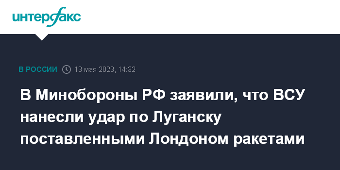 Москва. 13 мая. INTERFAX.RU - Украина использовала поставленные Великобританией авиационные ракеты Storm Shadow для удара по Луганску накануне вечером, заявили в Минобороны РФ.