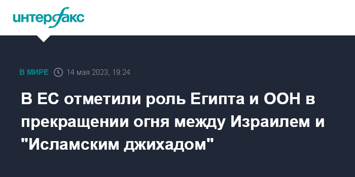 Москва. 14 мая. INTERFAX.RU - Европейский союз приветствует объявленное прекращение огня между Израилем и палестинским "Исламским джихадом", которое должно положить конец насилию в Газе и вокруг нее, заявил официальный представитель Европейской внешнеполитической службы (ЕВС).