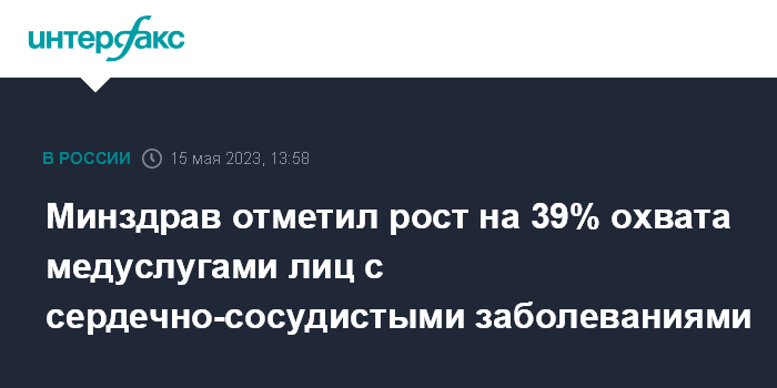 Москва. 15 мая. INTERFAX.RU - В 2022 году в России охват медицинскими услугами пациентов с болезнями системы кровообращения (БСК), состоящих под диспансерным наблюдением, увеличился на 39% к 2021 году; роста числа нарушений при оказании медицинской помощи не отмечается, сообщили в федеральном Минздраве.