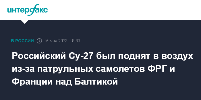 Москва. 15 мая. INTERFAX.RU - Российские военные поднимали истребитель Су-27 из-за приближения патрульных самолетов Германии и Франции к границе РФ над Балтийским морем, сообщили в Национальном центре управления обороной (НЦУО) РФ.