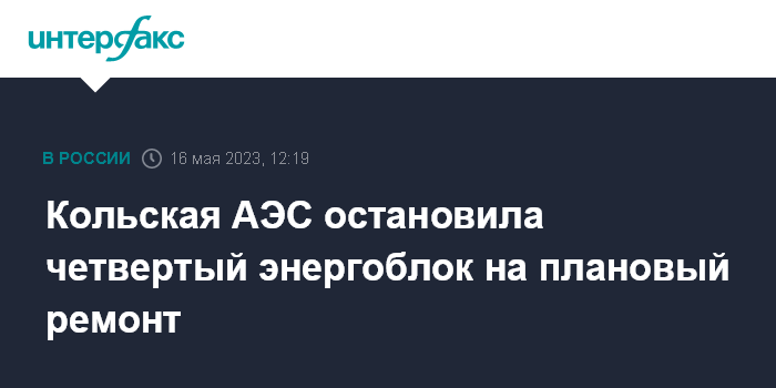 Москва. 16 мая. INTERFAX.RU - Кольская АЭС (КАЭС, Мурманская область) вывела в планово-предупредительный ремонт энергоблок №4. Об этом сообщила пресс-служба атомной станции.
