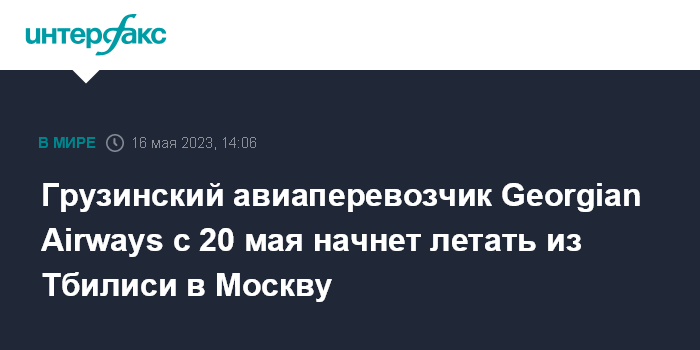 Грузинский авиаперевозчик Georgian Airways с 20 мая начнет летать из Тбилиси в Москву