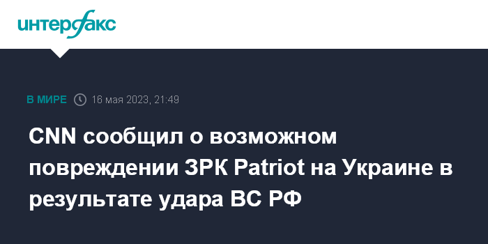 Москва. 16 мая. INTERFAX.RU - Зенитный ракетный комплекс (ЗРК) Patriot производства США, по всей видимости, оказался поврежденным, но не полностью уничтоженным в результате действий военных РФ на Украине, передает во вторник CNN со ссылкой на неназванного представителя американских властей.
