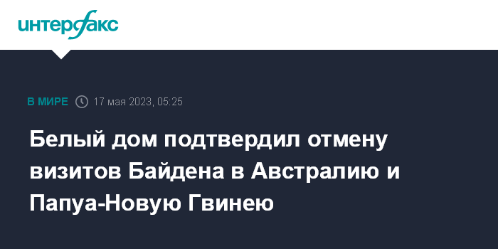 Москва. 17 мая. INTERFAX.RU - Белый дом подтвердил сообщения СМИ о том, что президент США Джо Байден отменил ранее планировавшиеся визиты в Папуа-Новую Гвинею и Австралию в связи с необходимостью присутствия в Вашингтоне для решения проблем, связанных с потолком госдолга.