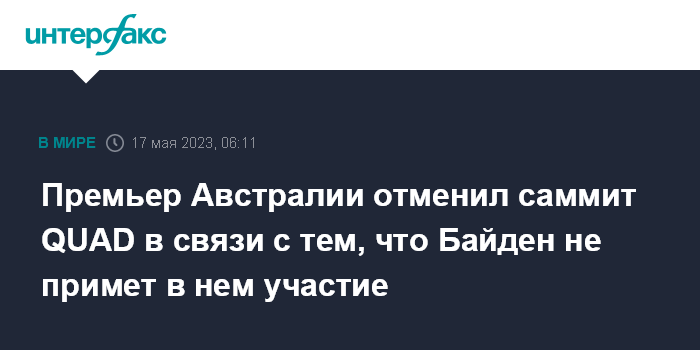 Москва. 17 мая. INTERFAX.RU - Премьер-министр Австралии Энтони Албаниз заявил, что запланированная на следующую неделю встреча Четырехстороннего диалога по безопасности (QUAD) в Сиднее с лидерами США, Японии и Индии в Сиднее отменена, передает австралийский телеканал ABC.