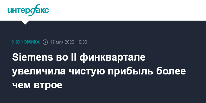 Москва. 17 мая. INTERFAX.RU - Германский промышленный конгломерат Siemens AG во втором квартале 2023 финансового года нарастил чистую прибыль более чем втрое, лучше прогнозов аналитиков.