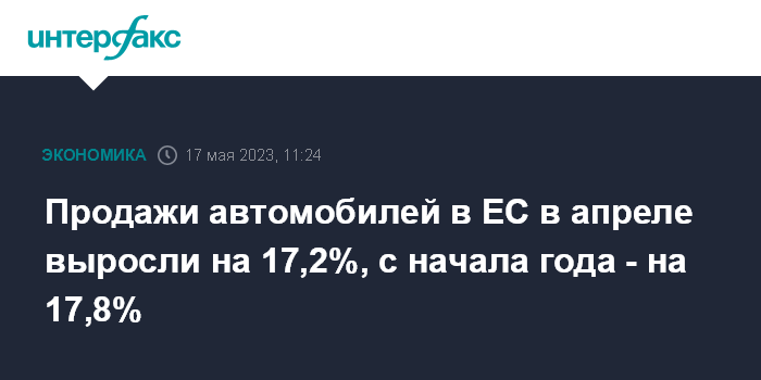 Москва. 17 мая. INTERFAX.RU - Продажи автомобилей в Европейском союзе (ЕС) в апреле выросли на 17,2% по сравнению с тем же месяцем прошлого года, составив 803 188 единиц, свидетельствуют данные Европейской ассоциации производителей автомобилей (ACEA).