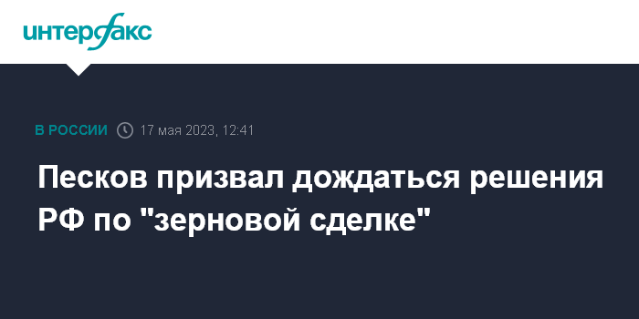 Москва. 17 мая. INTERFAX.RU - Пресс-секретарь президента РФ Дмитрий Песков назвал неуместными рассуждения о судьбе "зерновой сделки" в сослагательном наклонении.