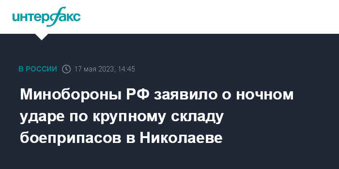 Москва. 17 мая. INTERFAX.RU - Российские военные ночью нанесли групповой удар корабельными ракетами по крупному складу боеприпасов на территории судоремонтного предприятия в Николаеве, заявил официальный представитель Минобороны РФ Игорь Конашенков на брифинге в среду.