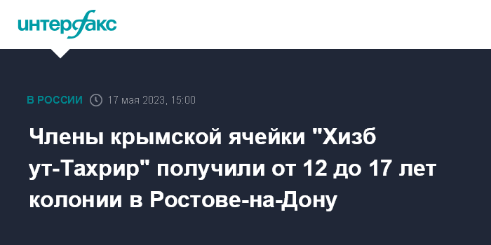 Москва. 17 мая. INTERFAX.RU - Южный окружной военный суд в Ростове-на-Дону приговорил к длительным срокам заключения трех жителей Крыма по делу об организации и участии в деятельности ячейки запрещенной в РФ террористической организации, сообщает пресс-служба суда.