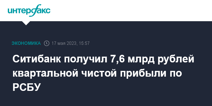Москва. 17 мая. INTERFAX.RU - В I квартале 2023 года Ситибанк получил 7,6 млрд рублей чистой прибыли по РСБУ, говорится в отчетности кредитной организации.