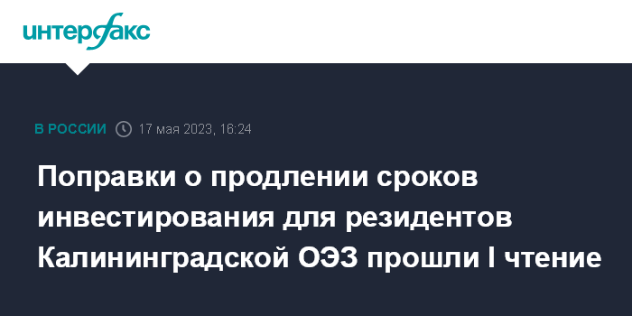 Москва. 17 мая. INTERFAX.RU - Госдума приняла в первом чтении правительственный законопроект, который позволяет увеличить с 3 до 6 лет срок инвестиционного проекта, реализуемого на территории Калининградской области для компаний, включенных в реестр резидентов Особой экономической зоны (ОЭЗ) с 1 января 2020 года по 31 декабря 2021 года.