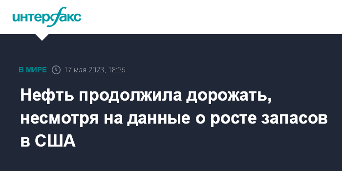 Москва. 17 мая. INTERFAX.RU - Цены на нефть продолжают расти вечером в среду, несмотря на данные о существенном росте нефтяных запасов в Соединенных Штатах.