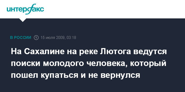 Южно-Сахалинск. 15 июля. ИНТЕРФАКС-ДАЛЬНИЙ ВОСТОК - На Сахалине на реке Лютога в Анивском районе ведутся поиски 22-летнего жителя Южно-Сахалинска.