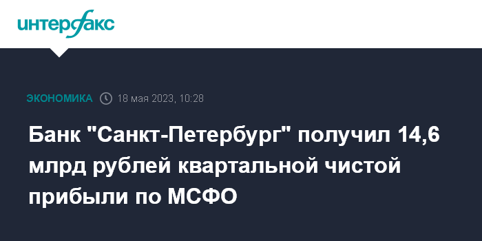 Москва. 18 мая. INTERFAX.RU - В I квартале 2023 года банк "Санкт-Петербург" получил 14,6 млрд рублей чистой прибыли по МСФО, говорится в сообщении банка.