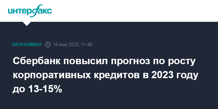 Москва. 18 мая. INTERFAX.RU - Сбербанк повысил прогноз по росту корпоративного кредитного портфеля в 2023 году до 13-15% (с 10-12% ранее), говорится в презентации банка.
