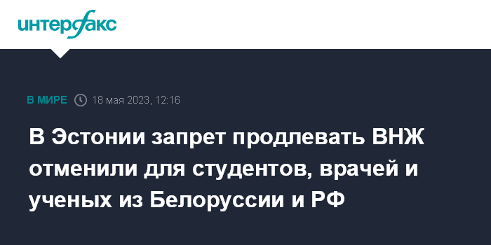 Москва. 18 мая. INTERFAX.RU - Правительство Эстонии решило исключить из санкционных списков российских и белорусских студентов, врачей и ученых, приехавших в республику до начала специальной военной операции.