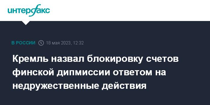 Москва. 18 мая. INTERFAX.RU - Блокировка счетов дипломатической миссии Финляндии в РФ не инициативный ход российской стороны, а ответ на недружественные действия, заявил пресс-секретарь президента РФ Дмитрий Песков.