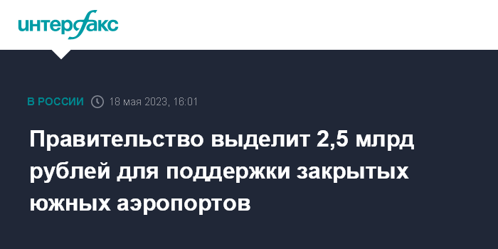 Москва. 18 мая. INTERFAX.RU - Правительство выделит более 2,4 млрд рублей для поддержки деятельности 11 закрытых аэропортов юга и центральной части России, сообщил на заседании премьер-министр Михаил Мишустин.