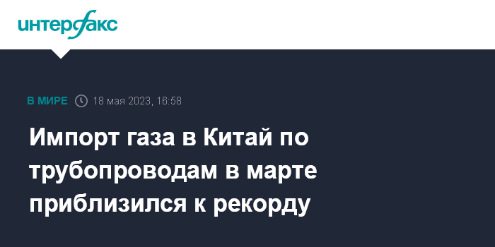 Москва. 18 мая. INTERFAX.RU - Китай в марте 2023 года импортировал по трубопроводам 5,475 млрд куб. м природного газа (+13% к марту 2022), что является вторым по величине значением за историю, сообщила таможня КНР. Пока что максимум поставок был зафиксирован в августе 2022 года (5,528 млрд куб. м).